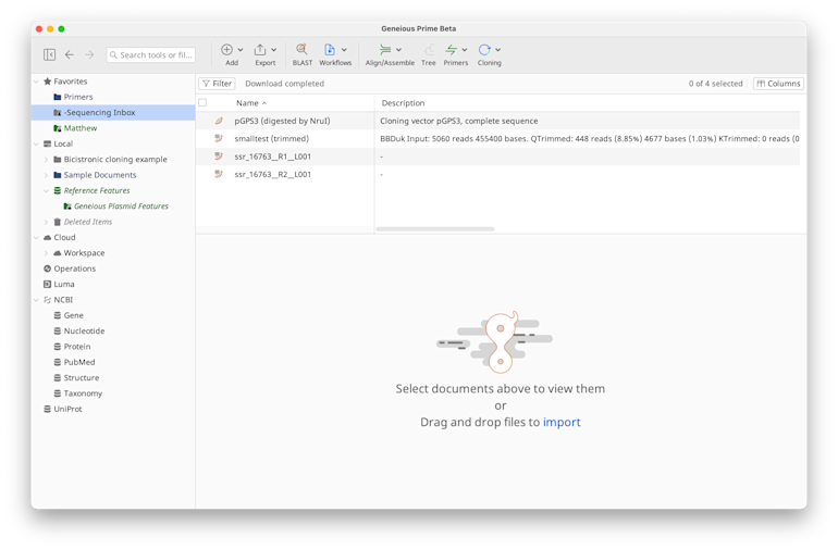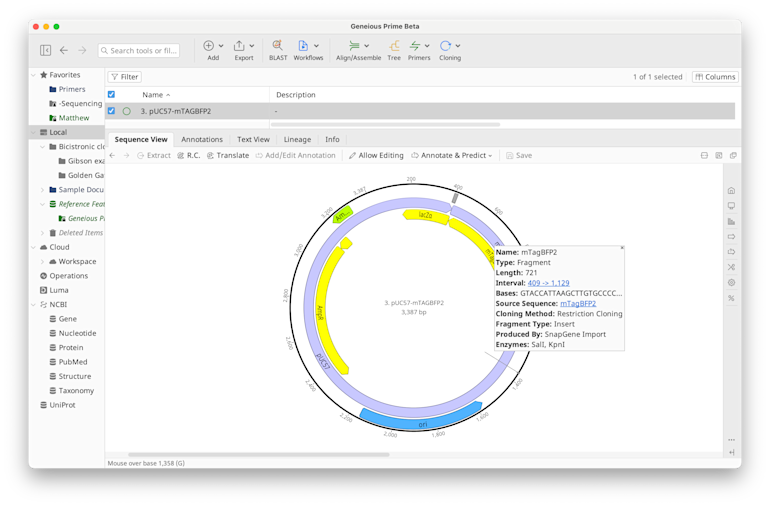 导入 SnapGene *.dna 文件时,现可为一级历史记录创建片段注释,展示特定克隆类型的模拟方法记录,并支持直接在 Geneious Prime 中恢复原始文件。