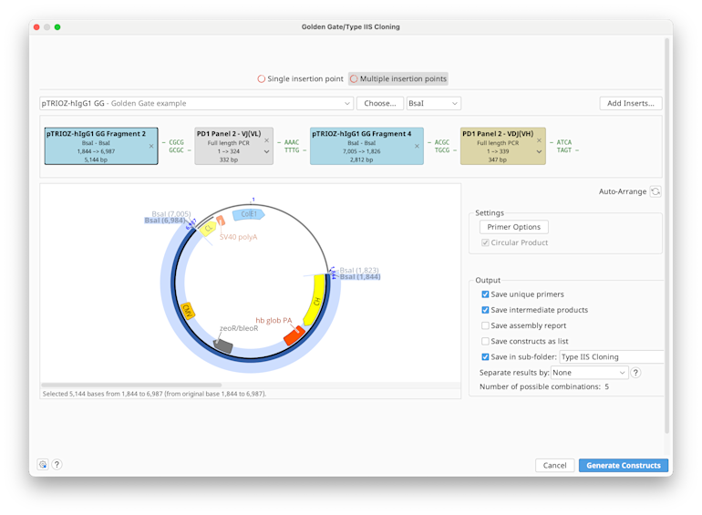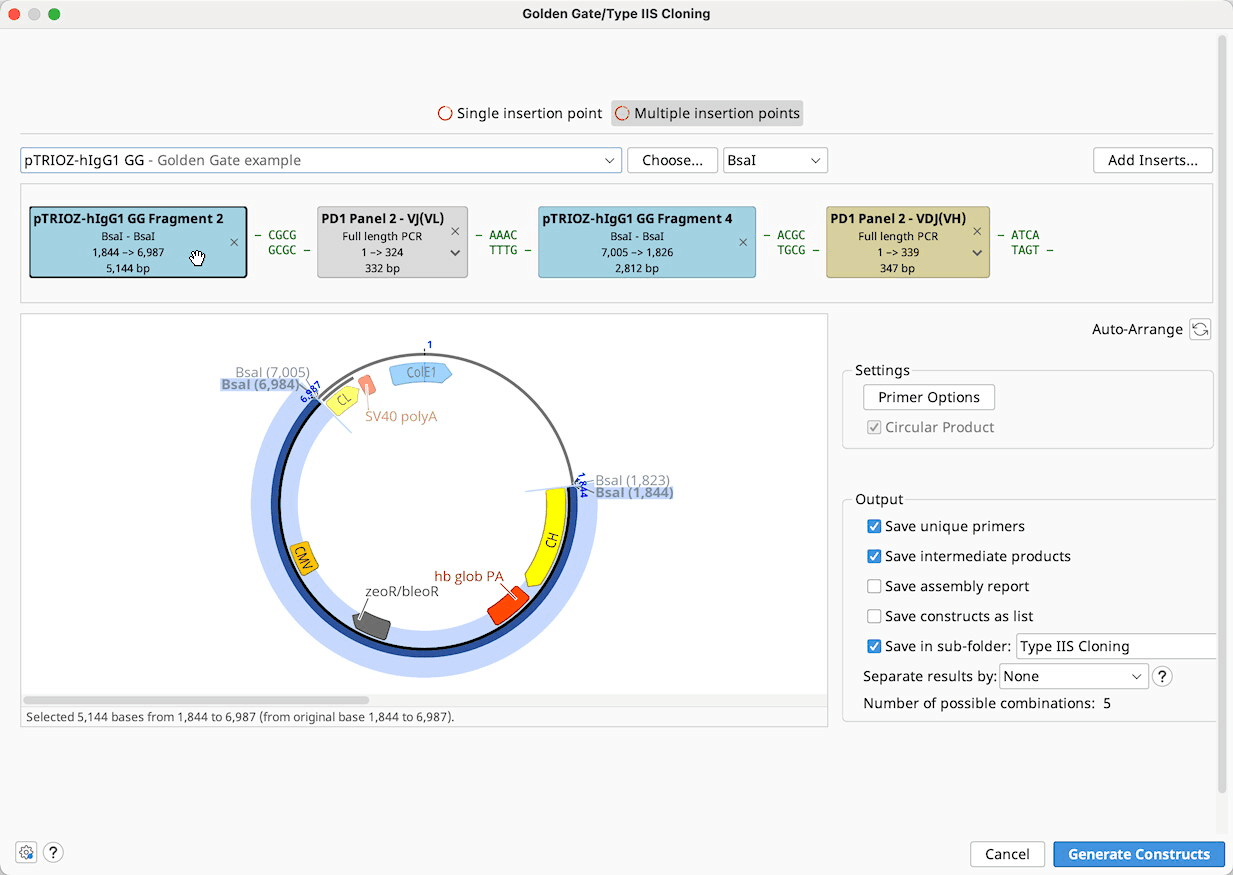 使用 Gibson、In-Fusion 和 Golden Gate 克隆技术,可快速构建载体骨架中多个位置插入片段的构建体。可对环状骨架在不同位置进行酶切,从而创建多个插入位点。